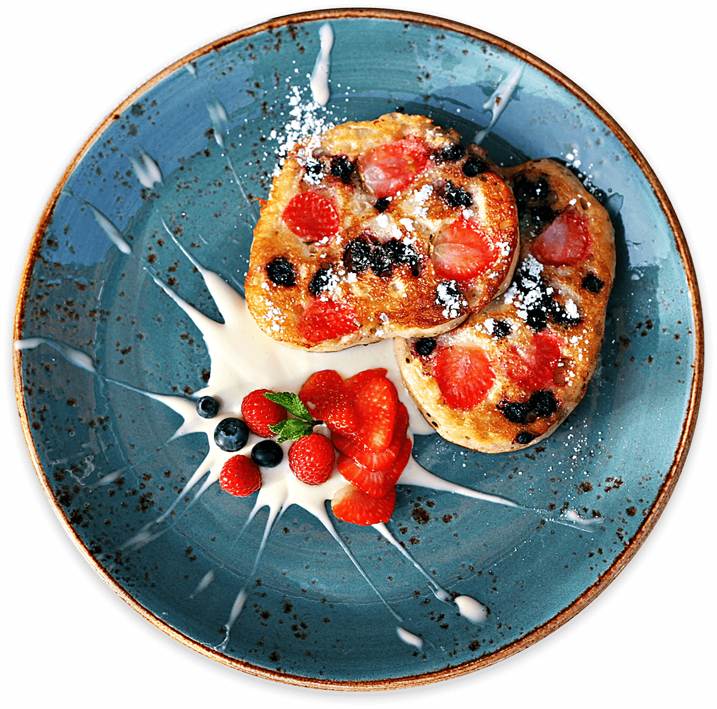 Tower of four pancakes, fresh fruit Fiordilatte ice cream and strawberry coulis.